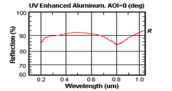 Aluminum coated mirrors are cost effective and offered in a variety of sizes. Bare aluminum is extremely delicate and susceptible to damage. A protective overcoat is layered over the aluminum to make it damage resistant. Our UV Enhanced coating is made by using an overcoat of MgF2 which is transparent in the UV allowing R>80% @200nm. Widely used in where the consistent high reflection in a wide spectral rang and UV is necessary.