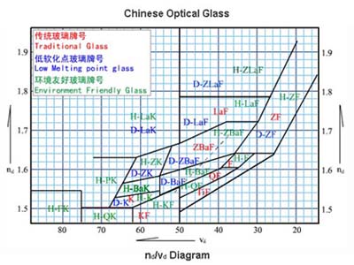 The specific selection depends on the optical performance requirement, environmental suitability, ease of fabrication and cost. The main characteristics of an optical material are represented by its refractive index (Nd) and its dispersion index (Abbe number).